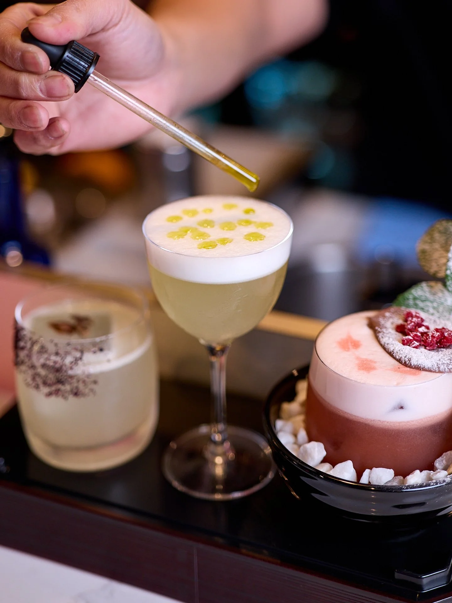 Suntory Toki Whisky, Bitters, Spiced-Orange Molecular Ravioli, Sakura Molecular Foam